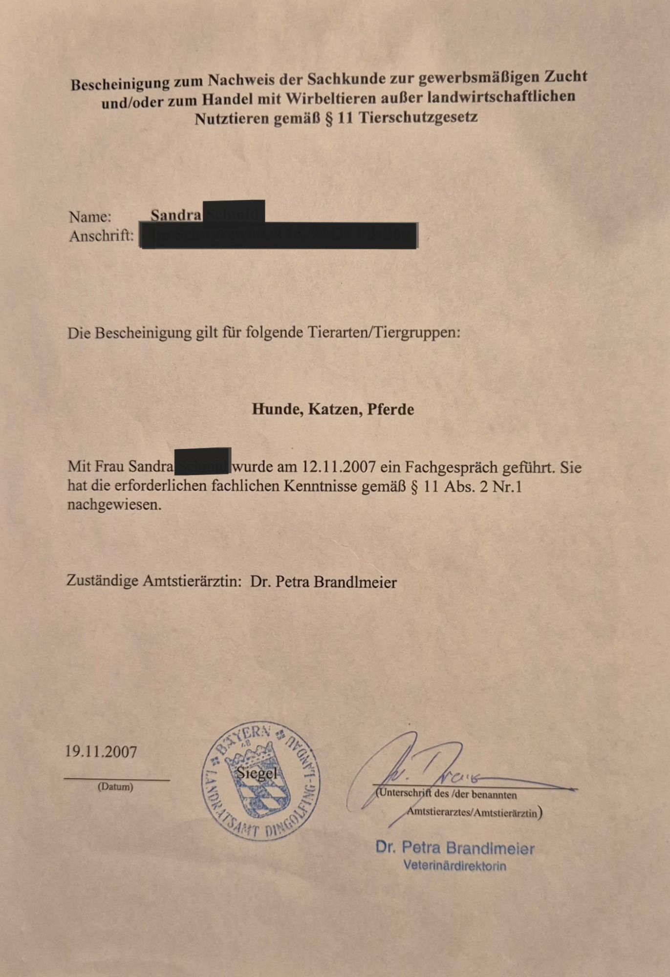 -11.2007 Sachkundenachweis Hunde/Katzen/Pferde